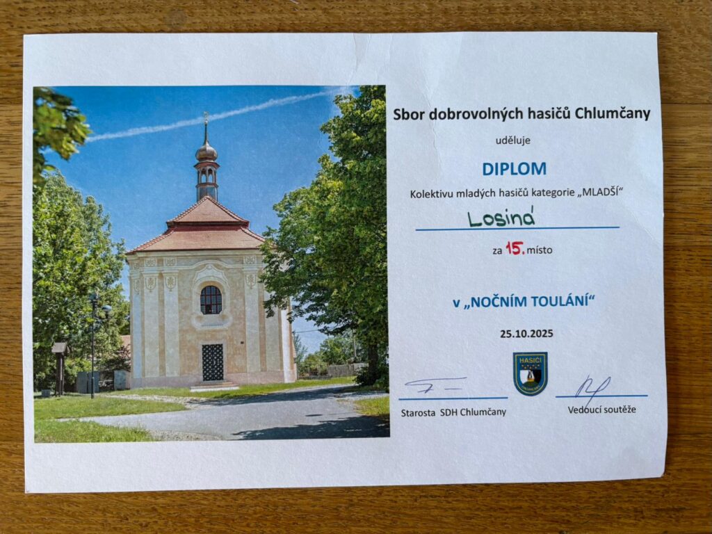 Druhé soutěžní klání, Noční toulání v Chlumčanech, se konalo 25. října 2025. Na start se postavilo 18 hlídek mladších žáků. Naši mladí hasiči už věděli, co je čeká, a díky větší jistotě i sehranosti jsme si vedli lépe – obsadili jsme 15. místo.